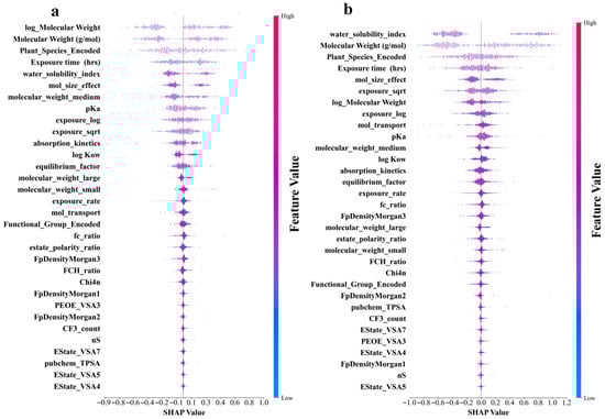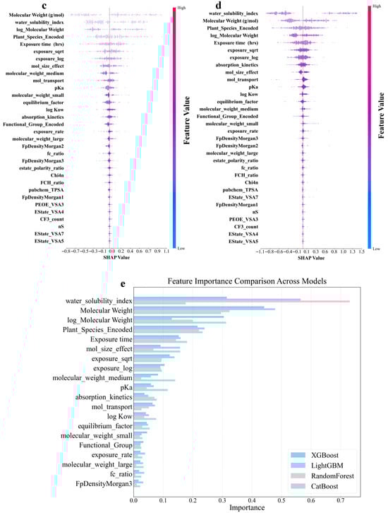 Figure 5a–d shows that the molecular structure and physicochemical properties were the dominant predictors across all models. Specifically, plant species and molecular weight-related features demonstrated consistently high absolute SHAP values, indicating their strong influence on the predictions. Furthermore, the exposure time and pKa ranked relatively high as secondarily important factors in all the models. In contrast, the degree of contribution of the electrotopological state (estate)-related characteristics was the lowest in all models. In addition, the different models leverage features in distinct ways. CatBoost relies on unique ordered target statistics and a symmetrical tree structure. In terms of molecular weight characteristics, the value range was moderate (−0.7 to 0.8), and the point distribution was dense and orderly. The feature SHAP distribution range of LightGBM was the widest, especially showing a significant color gradient change in the water solubility index (−1.1 to 1.2), reflecting its tendency to maximize the information gain of a single feature based on the leaf-first strategy. XGBoost exhibited a characteristic distribution between the two. The random model with the lowest prediction accuracy exhibited the most extreme feature differentiation. The SHAP values of the plant species features were abnormally dispersed (−1.0 to 1.3), and the low-ranked features had almost no SHAP contribution. This “black-or-white” evaluation model stems from the simple averaging mechanism of its basic decision tree and the random feature subsampling strategy. The lack of fine adjustment ability of the gradient optimization process for the relationships between subtle features resulted in fewer gradient transitions and a greater aggregation of extreme values, as shown in Figure 5d. An analysis of the feature-importance results for the four models is shown in Figure 5e. All four ML models in this study were assigned extremely high importance scores for molecular weight-related features, which were consistent with the results of the SHAP analysis. In addition, the reliance of the RF on the water solubility index remained the most extreme (0.73), much higher than its assessment of molecular weight (0.32). This pattern, which is overly dominated by a single feature, may cause it to ignore the multifactor synergy effect, thereby becoming a possible reason for its low prediction accuracy. These findings revealed unique feature interpretation perspectives using different algorithmic architectures. This provided a multidimensional empirical basis for understanding the complex relationships between molecular properties and biological effects in prediction models.