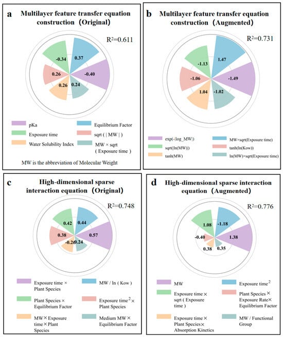 The HSIE model based on the original data (R2 = 0.748) (Figure 6c) revealed that the interaction between the exposure time and plant species squared (0.57) had the strongest positive correlation, indicating that plant characteristics exhibited nonlinear cumulative effects during the exposure periods. The molecular weight-to-log Kow ratio (0.44) was the second most influential factor, demonstrating that bioaccumulation followed scale-invariant relationships based on relative molecular properties rather than absolute values. The molecular-weight interaction between exposure time and plant species (−0.26) exhibited a negative correlation, indicating that larger molecules showed reduced bioaccumulation efficiency in certain plant-exposure combinations. The HSIE model, based on enhanced data (R2 = 0.776) (Figure 6d), showed improved predictive performance through refined parameterization. The molecular-weight term (1.38) became the dominant positive factor, indicating that absolute molecular size plays a crucial role in bioaccumulation. The opposing trends between the negative exposure time-squared term (−1.18) and positive exposure time-square root interaction (1.08) revealed a biphasic bioaccumulation pattern in which the initial rapid uptake transitions to diminishing root concentrations due to translocation to aerial plant parts during prolonged exposure. The interaction between exposure time, plant species, and absorption kinetics (0.38) demonstrated that specific plant species developed enhanced absorption efficiency over extended exposure periods, likely reflecting adaptive physiological responses such as increased membrane permeability or upregulated transporter activity.