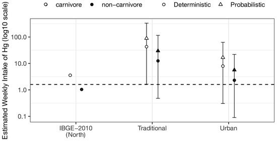 - Passos, C.J.S.; Silva, D.S.; Lemire, M.; Fillion, M.; Guimaraes, J.R.D.; Lucotte, M.; Mergler, D. Daily mercury intake in fish-eating populations in the Brazilian Amazon. J. Expo. Sci. Environ. Epidemiol. 2008, 18, 76–87. [Google Scholar] [CrossRef]