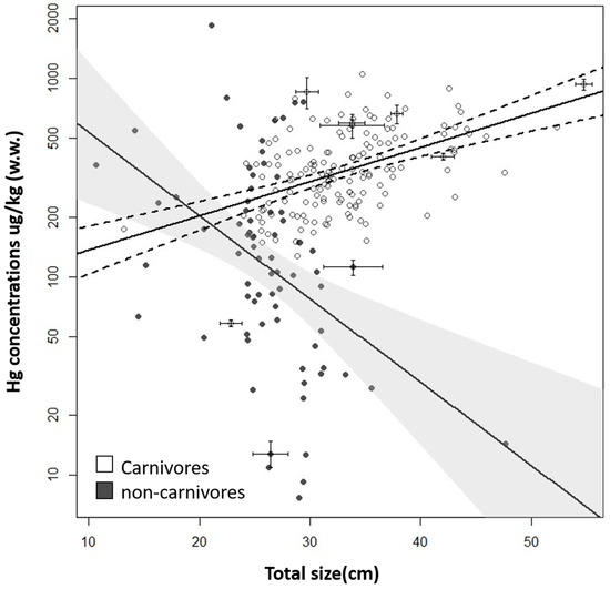 - Dang, F.; Wang, W.X. Why mercury concentration increases with fish size? Biokinetic explanation. Environ. Pollut. 2012, 163, 192–198. [Google Scholar] [CrossRef] [PubMed]