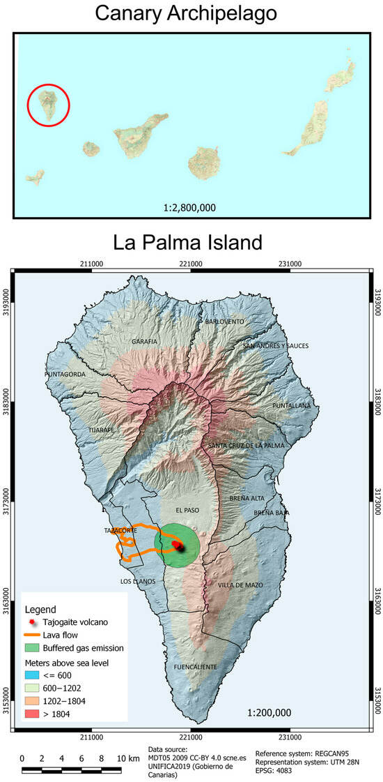 Among the Canary Islands, La Palma is distinguished by its rich biodiversity and varied landscape. Located at 28°26′ N latitude and 14°01′ W longitude, the island covers approximately 708 km2 and has a population of over 83,000 inhabitants. In the western region near the volcano, about 41,000 residents are concentrated [26].