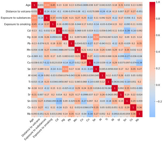 Spearman’s correlation matrix revealed strong correlations between participant age, years of smoking, and years of occupational exposure to toxic substances. Additionally, a robust correlation was observed between Se and Hg (p < 0.001). Furthermore, proximity to the volcano was significantly associated with higher levels of Al (p = 0.009) and Ti (p = 0.021) (Figure 2).