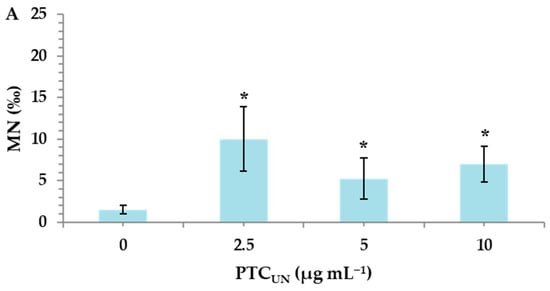 Untreated and acid-treated PTC were studied at three different nominal concentrations (2.5, 5, and 10 μg mL−1) to identify their potential risk of inducing genotoxic effects in cultured human lymphocytes. MMC, a widely used alkylating antibiotic compound with genotoxic potential [], which was used as a positive control, led to a statistically significant MN induction (26.5 ± 0.7), as expected. A statistically significant difference was observed between the control and both PTCUN and PTCAT. Specifically, in PTCUN, the highest significant differences in MN frequencies in comparison with the control were recorded in 2.5 μg mL−1 (Figure 2A), while in the case of PTCAT, a dose-dependent pattern was observed, with all tested concentrations being genotoxic (Figure 2B).