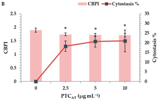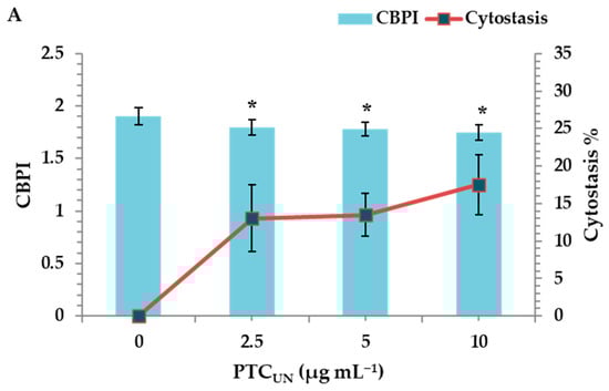 The cytotoxic activity of PTCUN and PTCAT was evaluated by determining the cytokinesis block proliferation index (CBPI) and % cytostasis through the CBMN assay. All tested concentrations (2.5, 5, and 10 μg mL−1) of PTCUN exhibited cytotoxic activity, with cytostasis ranging from 13% to 17.5% at the highest concentration (Figure 3A). Similarly, PTCAT showed cytotoxic effects across all tested concentrations, with cytostasis ranging from 18.5% to 21% at the highest concentration (Figure 3B).