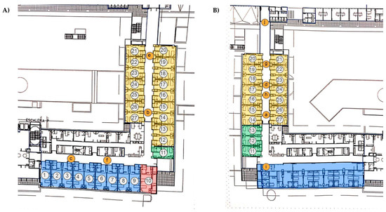 The layout of ward 2N is L-shaped and includes a mix of double-occupancy rooms and a dedicated room for healthcare staff to change clothing (Figure 1A). Meanwhile, ward 3O has a rectangular configuration with only single-occupancy rooms, three of which are equipped with negative pressure systems (Figure 1B).