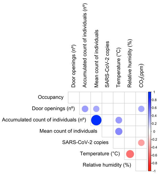 The next approach was to analyze the correlations between the environmental variables (Figure 2). Expected correlations were found, such as the inverse correlation between temperature and relative humidity. Both variables affect SARS-CoV-2-laden bioaerosols and infectivity [42]. Intermediate indoor relative humidity values (40–60%) were associated with a lower spread and severity of COVID-19 outbreaks compared to extreme values [43], while differences in temperature (from 10 to 40 °C) have a greater influence than relative humidity on SARS-CoV-2 decay [44]. In our study, SARS-CoV-2 levels were not associated with relative humidity or temperature, probably because these variables were maintained within a narrow range. Another expected correlation was between the counting of people and door openings with temperature, as the intensity of human activity significantly influences indoor thermal conditions [45]. Moreover, the opening of patient doors was also positively correlated with the CO2 levels assessed in the corridor, suggesting there is airflow from the patient rooms, which might be less ventilated, to the corridors.