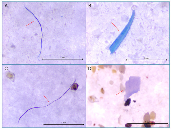 Each Erlenmeyer flask underwent three sequential rinses with 50 mL of distilled, filtered water. To mitigate cross-contamination, all instruments and work surfaces were meticulously cleaned and rinsed with deionized water between samples. The membrane filters were then carefully transferred into clean glass Petri dishes, covered to shield from airborne contaminants, and allowed to air dry at room temperature for 24 h. Post-drying, the filters were examined under a Leica EZ4 stereomicroscope (Leica Microsistemas S.L.U., Hospitalet de Llobregat, Spain) to identify microplastic particles. For each fish specimen, the number of MPs was recorded, along with their color and morphological characteristics. MPs were categorized into two types: ‘fibers’ (elongated, thread-like particles) and ‘fragments’ (irregularly shaped pieces) [17]. High-resolution images of the identified MPs were captured using a Leica DFC295 digital camera, with up to 11.5× magnification, and analyzed using Leica Application Suite software v4.