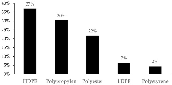 A total of 46 plastic elements, 33 fibers and 13 fragments, were analyzed by μ-ATR-FTIR. The analysis evidenced that over 90% of the fragments, both in digestive tracts and sediments, were polyethylene, particularly high-density polyethylene (HDPE) (69%) and low-density polyethylene (LDPE) (23%), whereas polystyrene accounts for the remaining 8%. However, fibers found in digestive tracts and sediments had a more heterogeneous conformation, where the three most abundant plastic types were polypropylene (42%), followed by polyester (30%), and HDPE (24%). Nonetheless, this classification might be biased, as the small size of some fibers made it very difficult to analyze with the μ-ATR-FTIR, and they were therefore discarded. The total polymeric composition of the identified fibers and fragments is presented in Figure 4.