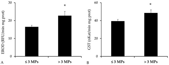 Activity of detoxification enzymes measured in intestinal homogenates of Bothus podas sampled in Mallorca (Balearic Islands). Specimens were categorized into two groups according to the median value for the presence of MPs: ≥3 MPs (n = 12) and <3 MPs (n = 12): (A) Ethoxyresorufin-O-deethylase (EROD); (B) Glutathione S-transferase (GST). Data are presented as mean ± S.E.M. Asterisks (*) denote statistically significant differences between groups (p < 0.05).