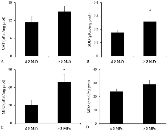 Intestinal levels of oxidative stress and inflammation markers in Bothus podas from Mallorca (Balearic Islands), grouped according to MP burden: <3 MPs (n = 12) vs. ≥3 MPs (n = 12). Biomarkers analyzed include (A) Catalase (CAT), (B) Superoxide dismutase (SOD), (C) Myeloperoxidase (MPO), and (D) Malondialdehyde (MDA). Data are reported as mean ± SEM. Asterisks (*) denote statistically significant differences between groups (p < 0.05).