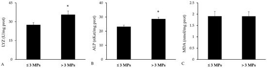 Immune biomarkers and malondialdehyde (MDA) measured in spleen homogenates of Bothus podas collected from Mallorca (Balearic Islands). Fish were divided into two groups based on the median number of detected: high-MP group (≥3 MPs, n = 12) and low-MP group (<3 MPs, n = 12): (A) Lysozyme (LYZ); (B) Alkaline phosphatase (ALP); (C) Malondialdehyde (MDA). Results are presented as mean ± S.E.M. Asterisks (*) denote statistically significant differences between groups (p < 0.05).