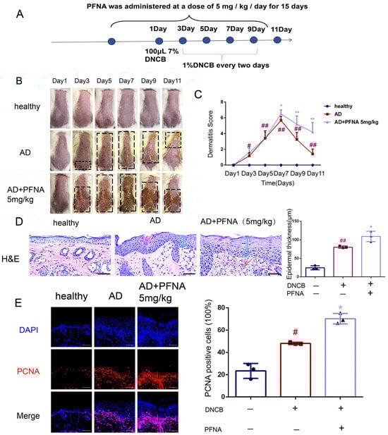 An AD mouse model was developed in BALB/c mice through DNCB induction to assess PFNA’s effects, with the experimental design outlined in Figure 1A. Typical AD symptoms such as erythema and scabbing were observed on the skin of the mice in the AD group from day 5 onwards, with a significant increase in erythema and scabbing, which continued until the end of day 11 (Figure 1B). Histopathological examination showed that the AD + PFNA group exhibited a significant increase in the thickness of the skin (Figure 1C). The thickening of the epidermis and dermis found in the AD group of mice was significantly increased compared with the mice in the healthy group, and this thickening was significantly increased after PFNA treatment (Figure 1C). In addition, the clinical skin score of the AD group increased significantly after induction, and the severity of dermatitis in the AD + PFNA group increased significantly after seven days (Figure 1D). Immunofluorescence analysis of the skin revealed significantly more PCNA-positive cells in the AD group than in the healthy group, and more PCNA-positive cells appeared in the AD + PFNA group (Figure 1E). Overall, this result provides support that PFNA can worsen AD-like symptoms in mice.