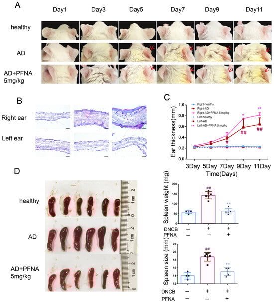 Effect of PFNA on ear thickness and spleen hypertrophy. (A) Photographs of ear skin lesions in DNCB-induced AD mice. (B) Sections of AD ear skin lesions, HE-stained (magnification ×10, scale bar: 100 µm) (n = 3). (C) Ear skin thickness measurements were taken with digital calipers (n = 4–6). (D) Photographs of spleen, spleen weight, and spleen length in DNCB-induced AD mice. Data in the plots are shown as the mean ± SD (n = 4–6). # p < 0.05 and ## p < 0.01 vs. the healthy group, * p < 0.05 and ** p < 0.01 vs. the AD group.
