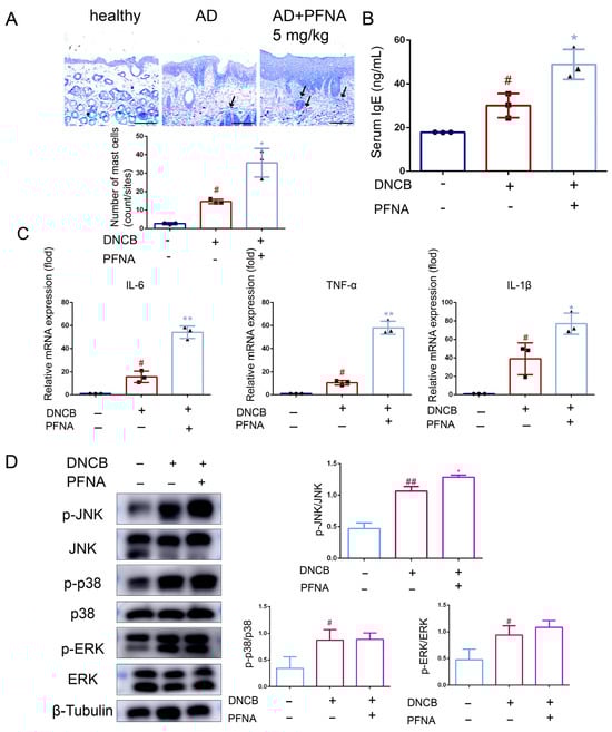 Mast cell (MC) infiltration represents a hallmark feature of atopic dermatitis (AD). MCs identified via toluidine blue staining were localized in the dermis, and the effect of PFNA was evaluated (Figure 3A). Few MCs were observed in the healthy group, whereas a significant increase in MC numbers was noted in the AD group. Compared with the model group, the AD + PFNA group exhibited enhanced MC infiltration. The IgE level in the serum was upregulated for the AD mice, and such upregulation of IgE was more significant in the AD + PFNA group compared with the healthy group (Figure 3B). The pro-inflammatory effect of PFNA was further examined by measuring the expression levels of TNF-α, IL-6, and IL-1β in the skin. Compared with the healthy group, the mRNA levels of TNF-α, IL-6, and IL-1β in the AD group were significantly upregulated, as shown by RT-qPCR analysis, with those in the AD + PFNA group being more pronounced (Figure 3C). The MAPK family proteins (JNK, ERK1/2, and p38MAPK) involved in anti-inflammatory responses also play an important role in inflammatory diseases []. As shown in Figure 3D, the AD mice showed significantly upregulated levels of p-JNK, p-ERK1/2, and p-p38 MAPK, but no change in the total JNK1/2, ERK1/2, and p38 MAPK. The AD + PFNA group showed a significantly upregulated p-JNK/JNK level. In general, this result demonstrates that PFNA exhibited pro-inflammatory activity through the MAPK signaling pathway. We investigated the effect of PFNA on the activation of the NF-κB signaling pathway (Figure S1A). Western blot results showed that the expression of p-IκBα and p-p65 was significantly increased in the AD mice, but the PFNA group did not have a significant effect on the expression of p-IκBα and p-p65 in the skin. Similarly, we investigated the effect of PFNA on apoptosis (Figure S1B). Western blot results showed that the PFNA group significantly upregulated caspase-3 expression in the skin.
