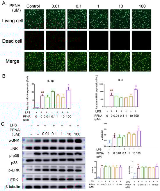 Pro-inflammatory effects of PFNA on LPS-stimulated RAW264.7 macrophages. (A) PFNA cytotoxicity in RAW264.7 macrophages. These cells were treated with indicated PFNA concentrations for 72 h, and cell viability was evaluated using calcein-AM/PI double fluorescent staining. (B) Effects of PFNA on the pro-inflammatory factor production by LPS-stimulated RAW264.7 macrophages. The cells were exposed to the indicated concentrations of PFNA for 72 h and then exposed to LPS (1 μg/mL) stimulation for 0.5 h. The mRNA levels of the pro-inflammatory factors IL-1β and IL-6 in the cells were measured by RT-qPCR. (C) Effects of PFNA on MAPK phosphorylation in LPS-stimulated RAW264.7 macrophages. RAW264.7 macrophages were exposed to the indicated concentrations of PFNA for 72 h, followed by exposure to 1 μg/mL LPS for 3 h. The levels of phosphorylated and total proteins for the indicated markers were determined by Western blot. β-Tubulin was used as an internal control. Data shown in each plot are the mean ± SD of three independent experiments. # p < 0.05 and ## p < 0.01 vs. non-LPS and non-PFNA-treated, * p < 0.05 and ** p < 0.01 vs. LPS and non-PFNA-treated.