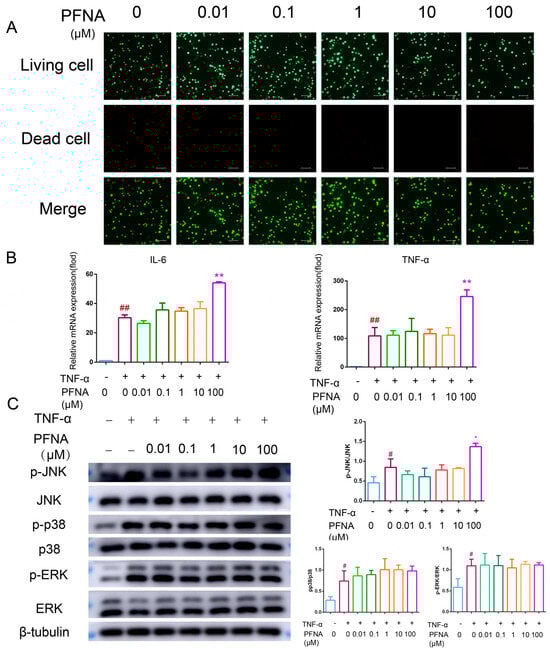 Pro-inflammatory effect of PFNA on TNF-α-stimulated bEnd.3 cells. (A) PFNA cytotoxicity in bEnd.3 cells visualized by calcein-AM/PI dual fluorescent staining. The bEnd.3 cells were exposed to the indicated concentrations of PFNA for 72 h before being stained with calcein-AM/PI for the observation of cell activity. (B) PFNA’s impact on pro-inflammatory factor generation in TNF-α-stimulated bEnd.3 cells. The bEnd.3 cells were exposed to the indicated concentrations of PFNA for 72 h, followed by exposure to TNF-α (20 ng/mL) stimulation for 0.5 h, and the mRNA levels of the pro-inflammatory factors IL-6 and TNF-α in the cells were measured by RT-qPCR. (C) Effect of PFNA on MAPK phosphorylation in TNF-α-stimulated bEnd.3 cells. The bEnd.3 cells were exposed to the indicated concentrations of PFNA for 72 h, followed by exposure to TNF-α (20 ng/mL) stimulation for 0.5 h. The levels of total and phosphorylated protein for the indicated markers were determined by Western blot. β-Tubulin was used as an internal control. Data shown in each plot are the mean ± SD of three independent experiments. # p < 0.05 and ## p < 0.01 vs. non-TNF-α and non-PFNA-treated, * p < 0.05 and ** p < 0.01 vs. TNF-α and non-PFNA-treated.