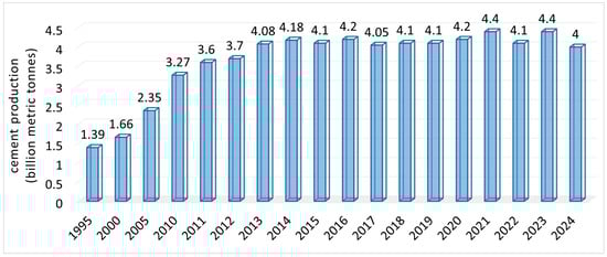 The cement demand exploded in 1960 due to the necessity of durable construction materials. The concrete industry uses around 50% of the cement produced, the other half being utilized for plasters, mortars, and blocks []. During 1995–2024, the total cement production increased from 1.39 billion metric tons to over 4 billion tons, with peaks of 4.4 billion tons in 2021 and 2023 (Figure 1) [,].