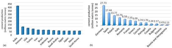 China is the world’s largest cement producer [], with 1.9 billion metric tons in 2024 (2.1 billion metric tons in 2023 and 2.4 billion metric tons in 2021), i.e., more than half of the world’s production [,,]. The increase in China’s cement production from 1990 was 74% of the worldwide growth []. India is the second largest producer in the world, followed by Vietnam, the USA, and Turkey (Figure 2a). In the European Union, Germany is the first-place holder, followed by Spain and Poland (Figure 2b).
