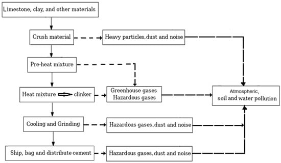 Given the complexity of the cement manufacturing process—from raw material extraction and transportation to the final product—numerous sources of pollution emerge, each contributing to potentially harmful environmental impacts. An overview of emissions generated at various stages of cement production is presented in Figure 3.