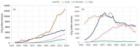 CO2 resulting from the combustion of oil, coal, natural gas, and cement industry in (a) Asia and (b) Europe—processed using data available in [,].