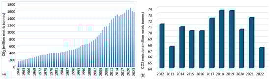 CO2 emissions from the cement industry (a) worldwide during 1960–2023 [,,,]; (b) in the European Union from 2013 to 2022 [].