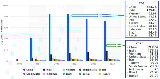 From the viewpoint of the total CO2 emissions from cement production per country, after 2005, the first position was constantly occupied by China (718 million metric tons in 2023), followed by India (about 4 times lower than China), Vietnam, and the USA, whose emissions were 4, 14, and 18 times lower than those of China, respectively. There was a variation in the ranking of the top ten countries, determined by the age of the manufacturing facilities and the technologies implemented [,]. Figure 6 provides a comparison between the CO2 volume emitted in 2021, 2022, and 2023. About 87% of emissions from this industry were issued in China (more than 52%) and developing countries (35%), especially from Asia, in over 2800 production facilities [].