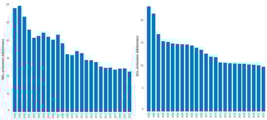 The concentrations of some gases resulting from cement production typically range as follows: SO2 < 10–3500 mg/Nm3, NOx < 200–3000 mg/Nm3, with NO2 5–10% of NOx emissions []. Variation in the levels of NOx and SOx emitted in the European Union from cement production during 1990–2022 is represented in Figure 7 []. NOx decreased by more than 60% from 1995 to 2022, while SOx emissions declined by about 50%. However, the reduction in NOx and SOx emissions from cement production in European countries, the USA, and Russia did not significantly impact the total emissions due to their increase in Asian countries, particularly China and India []. The decline in SOx and NOx emissions from the cement industry reflects the combined effects of regulations (e.g., EU’s Industrial Emissions Directive, US EPA Clean Air Act standards, India’s National Clean Air Programme), the use of cleaner fuels, better technologies (e.g., Improved Combustion and Process Control), and operational efficiencies (e.g., energy efficiency and decarbonization measures), all part of a broader drive toward sustainability and decarbonization.