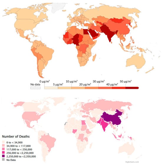 (top) Exposure to PM in 2019 (from https://ourworldindata.org/grapher/pm25-air-pollution?time=2019) (accessed on 1 June 2025).; (bottom) number of deaths in 2021 due to atmospheric pollution (from https://www.stateofglobalair.org/hap) (accessed on 1 June 2025).