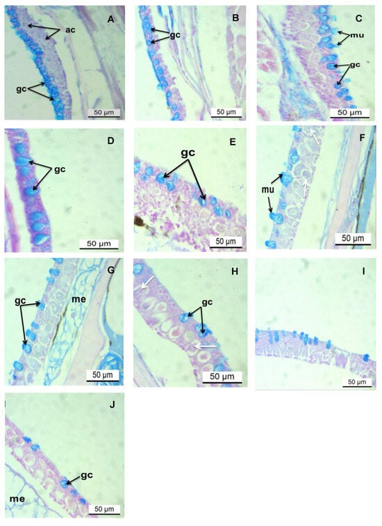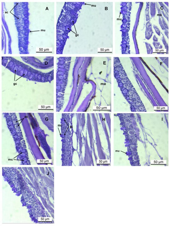 Longitudinal sections of zebrafish skin from treatment with various concentrations of AgNPs. Alcian blue (AB pH 2.5) stain. Scale bar = 50 µm. (A) shows a control slide. (B–D) shows sections exposed to 0.031 μg/L, 24, 48, and 96 h, respectively. (E–G) shows sections exposed to 0.250 μg/L, 24, 48, and 96 h, respectively. (H–J) show sections exposed to 5.000 μg/L, 24, 48, and 96 h, respectively. Abbreviations: ac, alarm cells; gc, goblet cells; mu, mucous; me, mesenchyme; the white arrows indicates irregularly shaped alarm cells.