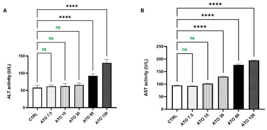 Effect of ATO dose regimens (7.5, 15, 30, 60, and 120 mg/kg) on the hepatic (A) ALT and (B) AST activities in rat model. Data are expressed as mean (5/group) ± S.D., analyzed using one-way ANOVA followed by Tukey’s post hoc test. **** p < 0.0001. CTRL: control; ATO: atorvastatin; ALT: alanine aminotransferase; AST: aspartate aminotransferase. “ns” indicates non-significant differences.