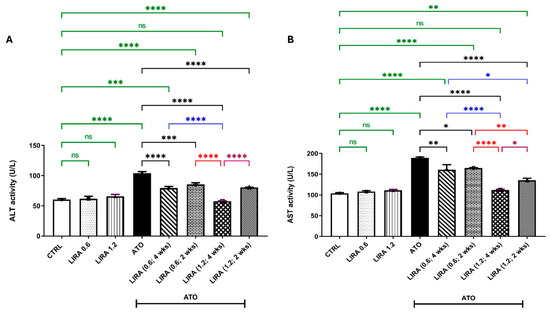 Effect of LD and HD LIRA on the hepatic (A) ALT and (B) AST activities in ATO-induced liver dysfunction in rat model. Data are expressed as mean (6/group) ± S.D., analyzed using one-way ANOVA followed by Tukey’s post hoc test. * p < 0.05; ** p < 0.01; *** p < 0.001; **** p < 0.0001. CTRL: control; LD: low dose; HD: high dose; LIRA: liraglutide; ATO: atorvastatin; ALT: alanine aminotransferase; AST: aspartate aminotransferase. “ns” indicates non-significant differences.