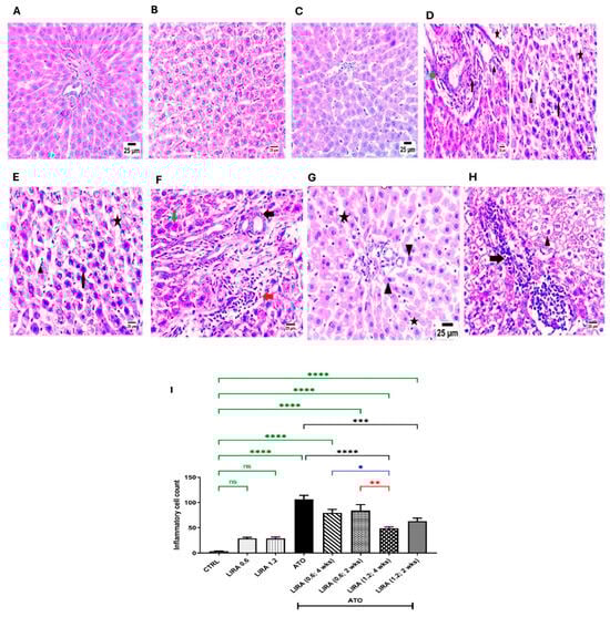 Effect of LD and HD LIRA on the hepatic histopathology in ATO-induced liver dysfunction in rat model. Photomicrographs representing H&E-stained hepatic tissues of (A) CTRL group, (B) LD LIRA (0.6 mg/kg) group, (C) HD LIRA (1.2 mg/kg) group, (D) ATO group, (E) ATO + LD LIRA group started from day 1, (F) ATO + LD LIRA group started from day 15, (G) ATO + HD LIRA group started from day 1, and (H) ATO + HD LIRA group started from day 15 (scale bar = 25 µm). Panel (I) demonstrates inflammatory cell count score. Black arrow: necrotic changes in hepatocytes; star: sinusoidal dilatation; green arrow: portal fibrosis; arrowhead: occasional nuclear pyknosis in some hepatocytes; red arrow: high number of mononuclear inflammatory cells. * p < 0.05; ** p < 0.01; *** p < 0.001; **** p < 0.0001. “ns” indicates non-significant differences. CTRL: control; LD: low dose; HD: high dose; LIRA: liraglutide; ATO: atorvastatin.