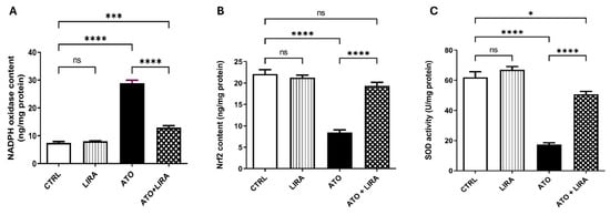 Effect of HD LIRA on the hepatic (A) NADPH oxidase, (B) Nrf2 content, and (C) SOD activity in ATO-induced liver dysfunction in rat model. Data are expressed as mean (6/group) ± S.D., analyzed using one-way ANOVA followed by Tukey’s post hoc test. * p < 0.05; *** p < 0.001; **** p < 0.0001. “ns” indicates non-significant differences. CTRL: control; LIRA: liraglutide; ATO: atorvastatin; NADPH-oxidase: nicotinamide adenine dinucleotide phosphate oxidase; Nrf2: nuclear factor erythroid 2-related factor; SOD: super oxide dismutase.