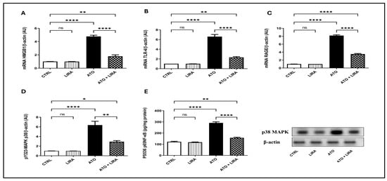 Effect of HD LIRA on the hepatic gene expressions of (A) HMGB1, (B) TLR-4, and (C) RAGE as well as (D) pY323-MAPK p38 protein expression and (E) pS536-p65NF-kB content in ATO-induced liver dysfunction in rat model. Data are expressed as mean (3–6/group) ± S.D., analyzed using one-way ANOVA followed by Tukey’s post hoc test. * p < 0.05; ** p < 0.01; **** p < 0.0001. “ns” indicates non-significant differences. CTRL: control; LIRA: liraglutide; ATO: atorvastatin; HMGB-1: high-mobility group box-1; TLR-4: toll-like receptor; RAGE: receptor of advanced glycated end-products; p38-MAPK: phosphorylated mitogen-activated protein kinase; p38 NF-kB: phosphorylated nuclear factor kapa-B.