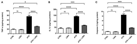 Effect of HD LIRA on the hepatic (A) TNFα, (B) IL-1β, and (C) caspase-3 contents in ATO-induced liver dysfunction in rat model. Data are expressed as mean (6/group) ± S.D., analyzed using one-way ANOVA followed by Tukey’s post hoc test. * p < 0.05; *** p < 0.001; **** p < 0.0001; “ns” indicates non-significant differences. CTRL: control; LIRA: liraglutide; ATO: atorvastatin; TNFα: tumor necrosis factor alpha; IL-1β: Interleukin1β.