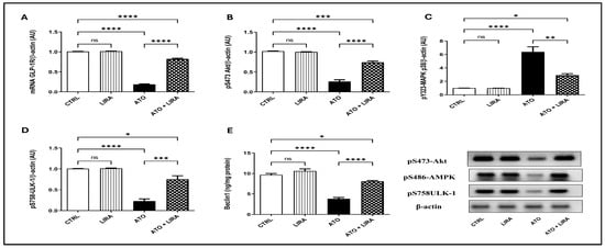 Effect of HD LIRA on the hepatic (A) mRNA GLP-1R, as well as the protein expression of (B) pS473-Akt, (C) pS486-AMPK, and (D) pS758-ULK-1 and (E) Beclin-1 content in ATO-induced liver dysfunction in rat model. Data are expressed as mean (3–6/group) ± S.D., analyzed using one-way ANOVA followed by Tukey’s post hoc test. * p < 0.05; ** p < 0.01; *** p < 0.001; **** p < 0.0001. “ns” indicates non-significant differences. CTRL: control; LIRA: liraglutide; ATO: atorvastatin; GLP-1: glucagon-like peptide-1 receptor; Akt: protein kinase B; AMPK: AMP-activated protein kinase.