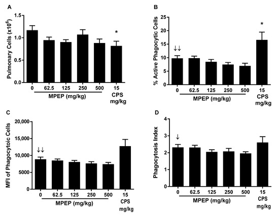 Pulmonary mononuclear cell phagocytosis of opsonized S. aureus rats administered 2-((1-(4-Phenoxyphenoxy)propan-2-yl)oxy)pyridine (MPEP). (A) Total pulmonary cells obtained per rat; (B) Percentage of pulmonary cells undergoing active phagocytosis; (C) Mean fluorescent intensity (MFI) of pulmonary mononuclear cells engulfing S. aureus (indicator of the number of particles engulfed per mononuclear cell); and (D) phagocytic index (ratio of MFI for mononuclear cells with and without bioparticles). N = 12/group for MPEP and 8/group for CPS. Significant negative exposure-related trend ↓ (p < 0.05) or ↓↓ (p < 0.01) with increasing dose of MPEP. * Significantly different from the vehicle control group (p < 0.05).