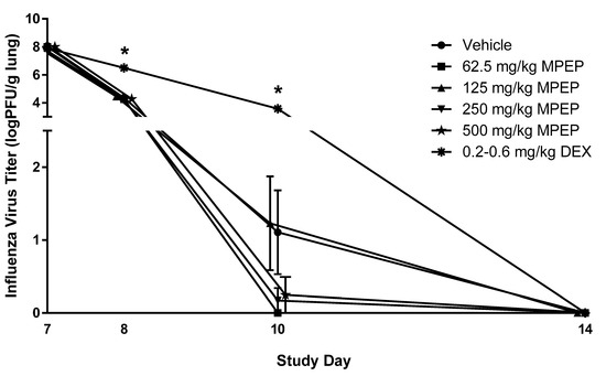 Infectious virus titer in the lungs of rats administered 2-((1-(4-Phenoxyphenoxy)propan-2-yl)oxy)pyridine (MPEP). MPEP treatment started on Day 0 and rats were infected with influenza on Day 6. Lung titers of influenza were measured on Days 7, 8, 10, 14, and 28 and all animals in all treatment groups had complete clearance by Day 14. Clearance of the virus from the lung was determined using an MDCK cell plaque assay. PFU—plaque forming unit; DEX—dexamethasone. N = 10/group/timepoint. * Significantly different from the vehicle control group (p < 0.05). The 500 mg/kg MPEP and 125 mg/kg MPEP data points were nudged slightly to the right and left, respectively, to improve visualization of the associated variation in response. All groups for each timepoint were euthanized and necropsied on the specified day.