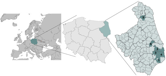 A map of the study area [33]: (1) Hajnówka, (2) Michałowo, (3) Narew, (4) Narewka, (5) Nowinka, (6) Supraśl.