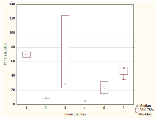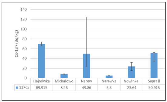 Figure 2 presents the mean activity concentrations and standard deviations of 137Cs in soil samples collected from six municipalities in north-eastern Poland. The lowest radioactivity was recorded in the Narewka municipality, with an average activity concentration of 5.3 ± 0 Bq/kg. In contrast, the highest level of 137Cs radioactivity was observed in soil from the Hajnówka municipality, where the average activity concentration reached 69.92 ± 5.72 Bq/kg. The widest range between minimum and maximum values was noted in samples from the Narew municipality.