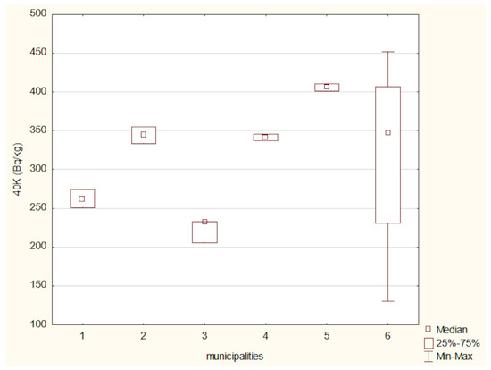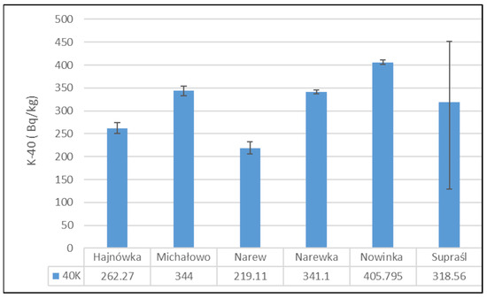 Figure 3 presents the mean activity concentrations and standard deviations of 40K in soil samples collected from six municipalities in north-eastern Poland. The lowest 40K activity concentration was recorded in the soil from the Narew municipality, with a mean value of 219.11 ± 19.05 Bq/kg. In contrast, the highest activity concentration was observed in the Nowinka municipality, reaching 405.80 ± 6.93 Bq/kg. The widest range between minimum and maximum values was noted in soil samples from the Supraśl municipality.