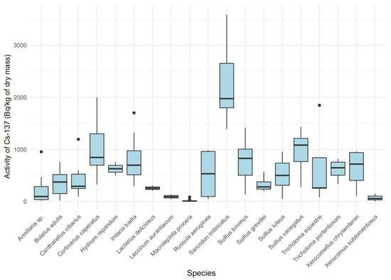 Variability in 137Cs activity [Bq/kg dry mass] by mushroom species.