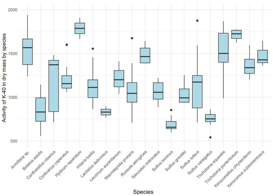 Variability in 40K activity [Bq/kg dry mass] among mushroom species.