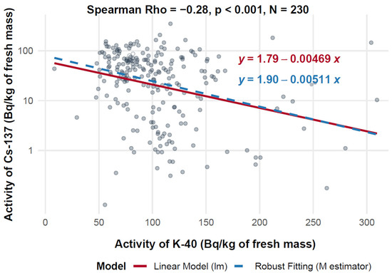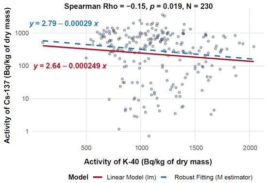 Figure 6 presents a scatter plot illustrating the relationship between 40K activity (on the X-axis, expressed in Bq/kg of dry mass) and 137Cs activity (on the Y-axis, also in Bq/kg of dry mass) across a dataset of 230 measurements. The analysis includes both ordinary least squares (OLS) linear regression and robust regression, the latter using an M-estimator to limit the influence of outliers. The Spearman correlation coefficient is −0.15 (p = 0.019), indicating a statistically significant but weak negative correlation between the two radionuclides.