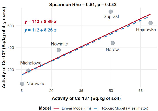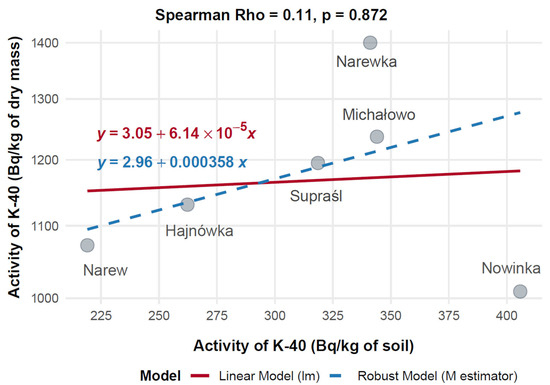 Spearman’s rank correlation coefficient (Rho) was used to assess the relationships between 40K and 137Cs activity concentrations. Correlations were considered statistically significant at p < 0.05 and were reported with Rho, p-values, and 95% confidence intervals (CI95%). Additionally, a robust linear regression model using an M-estimator was applied to assess these relationships, offering a complementary analysis that is resilient to outliers. Correlation results were presented with Rho and p-values and visualized using scatter plots that included both standard linear regression and robust fitting lines.
