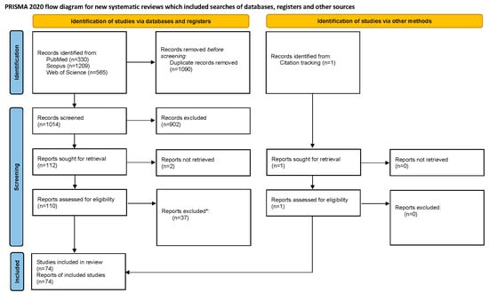 Our search strategy identified 2105 studies. The automatic deduplication tool identified 1090 duplicate records. We screened 1014 potentially relevant studies, and after screening, we extracted data from 74 studies that were ultimately included in the analysis. The whole process of identification, screening, retrieval, and inclusion of relevant studies is presented as a flow diagram in Figure 1. The studies we excluded after full-text screening are given in Supplementary Table S1 [,,,,,,,,,,,,,,,,,,,,,,,,,,,,,,,,,,,,].
