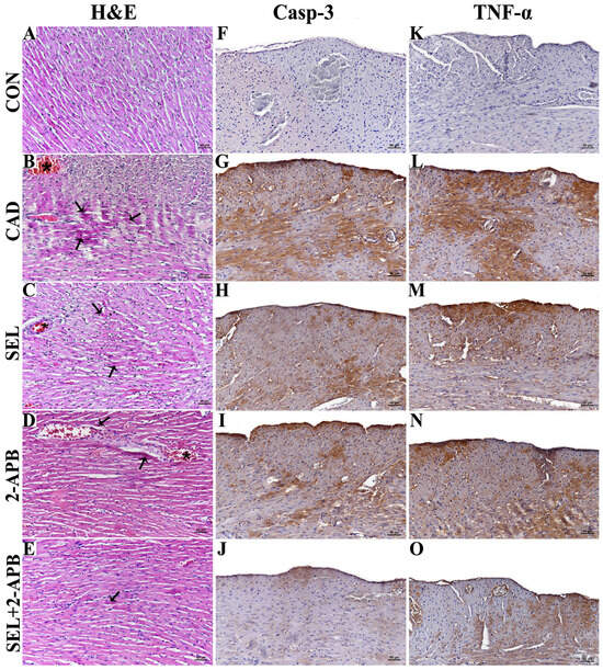 Histopathological analyses (A–E); Hematoxylin and eosin (H,E)-stained light microscopic pictures of cardiac tissue are used for histopathological examinations. (A) (CON): Normal histological appearance of the heart is observed. (B) (CAD): Degenerations and necrosis in the myocyte (arrows), and vascular congestion (*). (C) (SEL): Necrosis and degeneration in the myocyte (arrows), and vascular congestion (*). (D) (2-APB): Necrosis and degeneration in the myocyte (arrow), vascular congestion (*). (E) (SEL+2-APB Group): Renal tubular epithelium degenerations and necrosis (arrow). (Bar: 50 µm). Immune expression of Caspase-3 (F–J); Effects of cadmium (CAD), selenium (SEL) and 2-Aminoethyl diphenylborinate (2-APB) on the immune expression of Casp-3 in the rat heart tissues: (F): CON, (G): CAD, (H): SEL, (I): 2-APB, (J): SEL+2-APB. (Bar: 50 µm). Immune expression of TNF-α (K–O); Effects of CAD, SEL and 2-APB on the immune expression of TNF-α in the rat heart tissues: (K): CON, (L): CAD, (M): SEL, (N): 2-APB, (O): SEL+2-APB. (Bar: 50 µm).