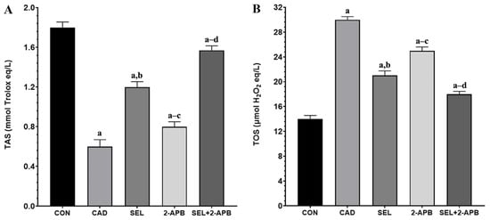 The impact of 2-Aminoethyl diphenylborinate (2-APB) and selenium (SEL) on total antioxidant (TAS) (A) and total oxidant (TOS) (B) values in cardiac damage caused by cadmium (CAD) (mean ± SD, and n = 8). [a p < 0.05 comp. CON, b p < 0.05 comp. CAD, c p < 0.05 comp. SEL, d p < 0.05 comp. 2-APB groups, and p-values were obtained using a one-way ANOVA test (post hoc Tukey) results].