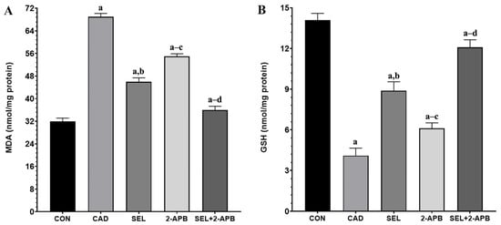 The impact of 2-Aminoethyl diphenylborinate (2-APB) and selenium (SEL) on malondialdehyde (MDA) (A) and glutathione (GSH) (B) values in cardiac damage caused by cadmium (CAD) (mean ± SD., and n = 8). [a p < 0.05 comp. CON, b p < 0.05 comp. CAD, c p < 0.05 comp. SEL, d p < 0.05 comp. 2-APB groups, and p values were obtained according to one-way ANOVA test (post hoc Tukey) results].