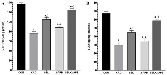 The impact of 2-Aminoethyl diphenylborinate (2-APB) and selenium (SEL) on glutathione peroxidase (GSH-Px) (A) and superoxide dismutase (SOD) (B) values in cardiac damage caused by cadmium (CAD) (mean ± SD., and n = 8). [a p < 0.05 comp. CON, b p < 0.05 comp. CAD, c p < 0.05 comp. SEL, d p < 0.05 comp. 2-APB groups, and p values were obtained according to one-way ANOVA test (post hoc Tukey) results].